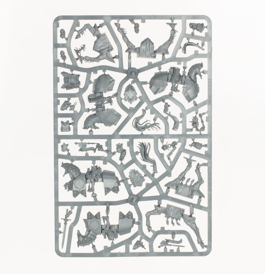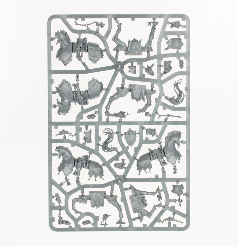 This multipart plastic kit builds five Freeguild Cavaliers, armoured human knights mounted on sturdy warhorses. Each Cavalier is protected by full plate armour and an ornate shield, swinging a variety of finely-wrought weapons to smash foes aside as they charge. You can build one Cavalier as a mounted Arch-Knight wielding a unique blade, and another as a Cavalier Herald whose flowing banner is topped by one of two different icons.