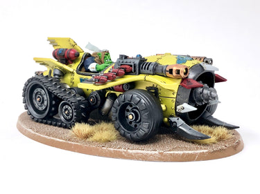 This multipart plastic kit contains the components necessary to assemble a Megatrakk Scrapjet. Built around the fuselage of a downed Ork aircraft, the Scrapjet is pretty much a metal tube covered in things that make enemies die – a front-mounted rokkit kannon (with belt-fed rokkits!), missiles which can be modelled mid-launch, a drill attached to the front turbine with accompanying spiked rams, a twin big shoota at the front and another twin big shoota crewed by a Grot rear gunner. While the wings have been broken off in whatever terrible accident grounded the Scrapjet, it’s still covered in fins and ailerons – after all, they look cool, and that’s what being a Flyboy is all about! The pilot himself is decked out in a flight jacket, goggles and a long scarf billowing out behind him, seated in a cockpit full of instruments (which he is, of course, ignoring). The Scrapjet is propelled by a huge jet exhaust at the back, which pushes the vehicle along via the tracked wheels attached to the rear.
