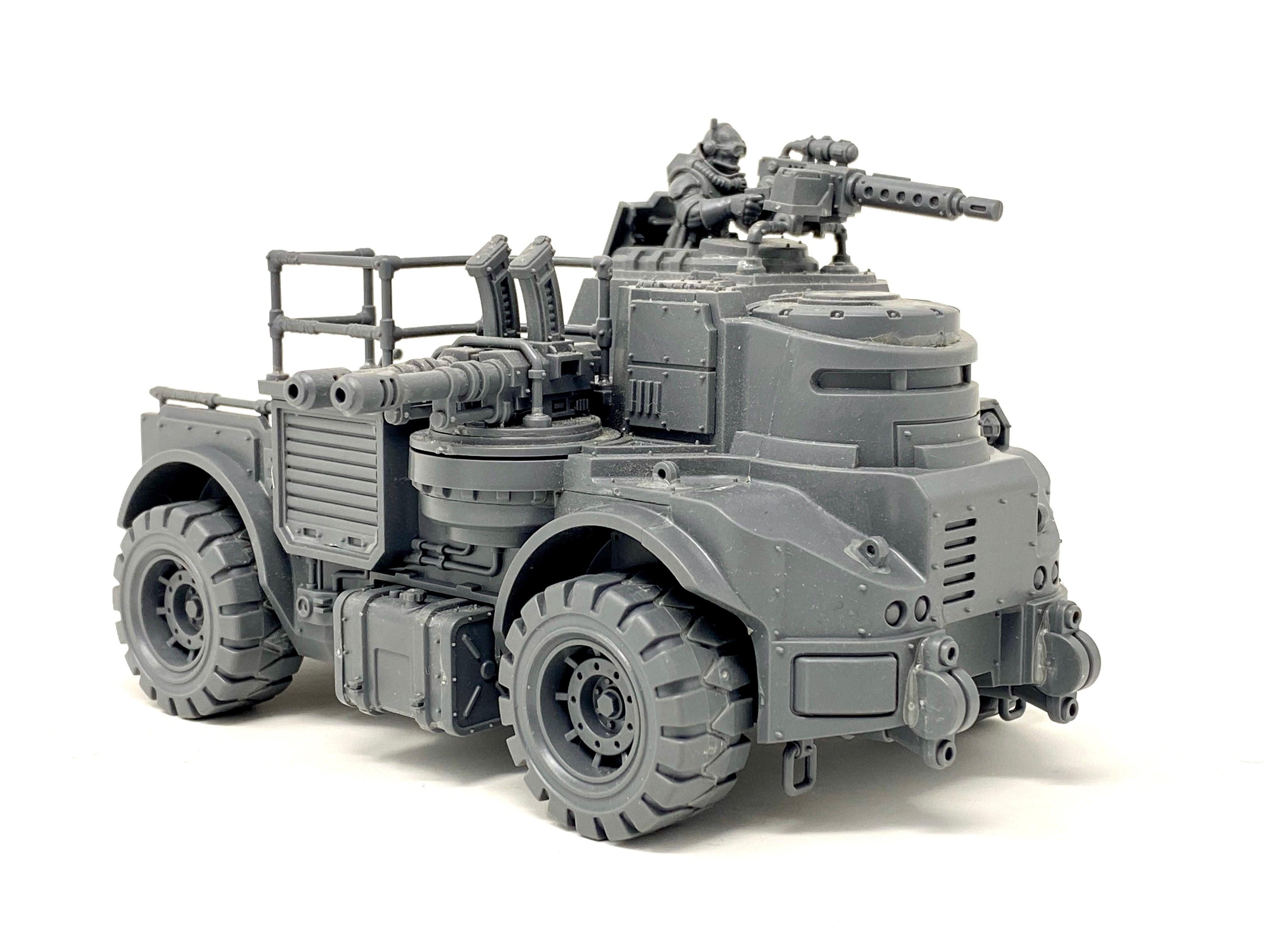 Goliath Truck, transport and offensive vehicle of the Genestealer Cults. It comes armed with a heavy stubber and twin-linked autocannon, and features a ton of customisation opportunities – the 4 crewmen have their own options and the wheels can be attached with high ground clearance.