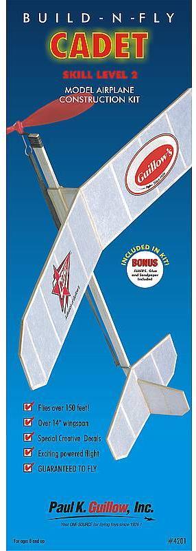 This is the SECOND SKILL LEVEL in the "Build-N-Fly" construction kit series, a series which will teach you how to build and enjoy flying model airplanes. The Cadet was one of the very first teaching designs of stick and tissue model airplanes when originally released in the 1940's. This kit includes the same ageless building material along with easy to follow instruction and child safe glue.