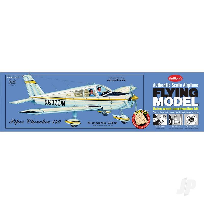 Now with LASER CUT BALSA PARTS. Fast, maneuverable, with a modern low wing and "total handling ease", the all metal Piper Cherokee 140 has been a common sight airports all over the country. More than just a point to point means of transportation, the 140 is licensed for spins, lazy 8's and chandelles characteristics which made the world famous Piper Cub the leading sport plane of its era. Last but not least, the 140 seats up to 4 adult passengers in relative comfort.
