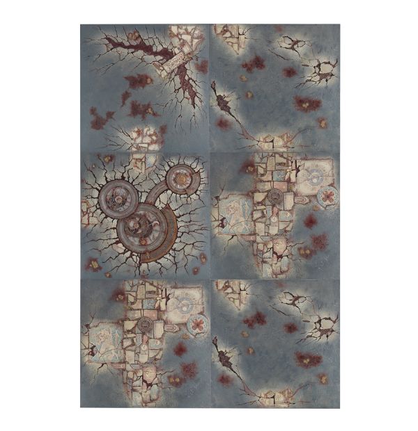 A high-quality, plastic, modular gaming surface, made from the same plastic as your miniatures and paintable in exactly the same way, the Realm of Battle: Shattered Dominion set is made up of six 2’x2’ square sections, arrangeable to create combinations of scenery for your games of Warhammer Age of Sigmar! Two of the tiles – the Fell Chasm and the Arcanabulum – have their own special rules, available to download for free in the Rules tab on the right: the Fell Chasm can swallow units whole, and provides a chokepoint for spectacular battles of attrition and defense, and the Arcanabulum is a huge piece of barely-understood clockwork, constantly shifting and changing below the feet of the warriors who battle upon it, able to affect even time itself!