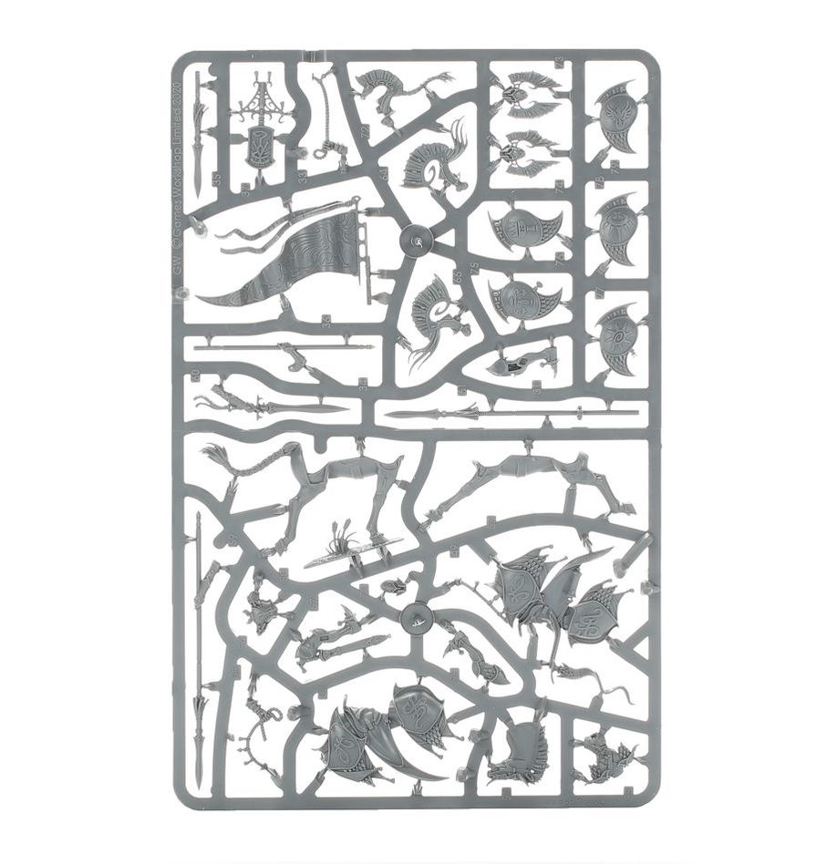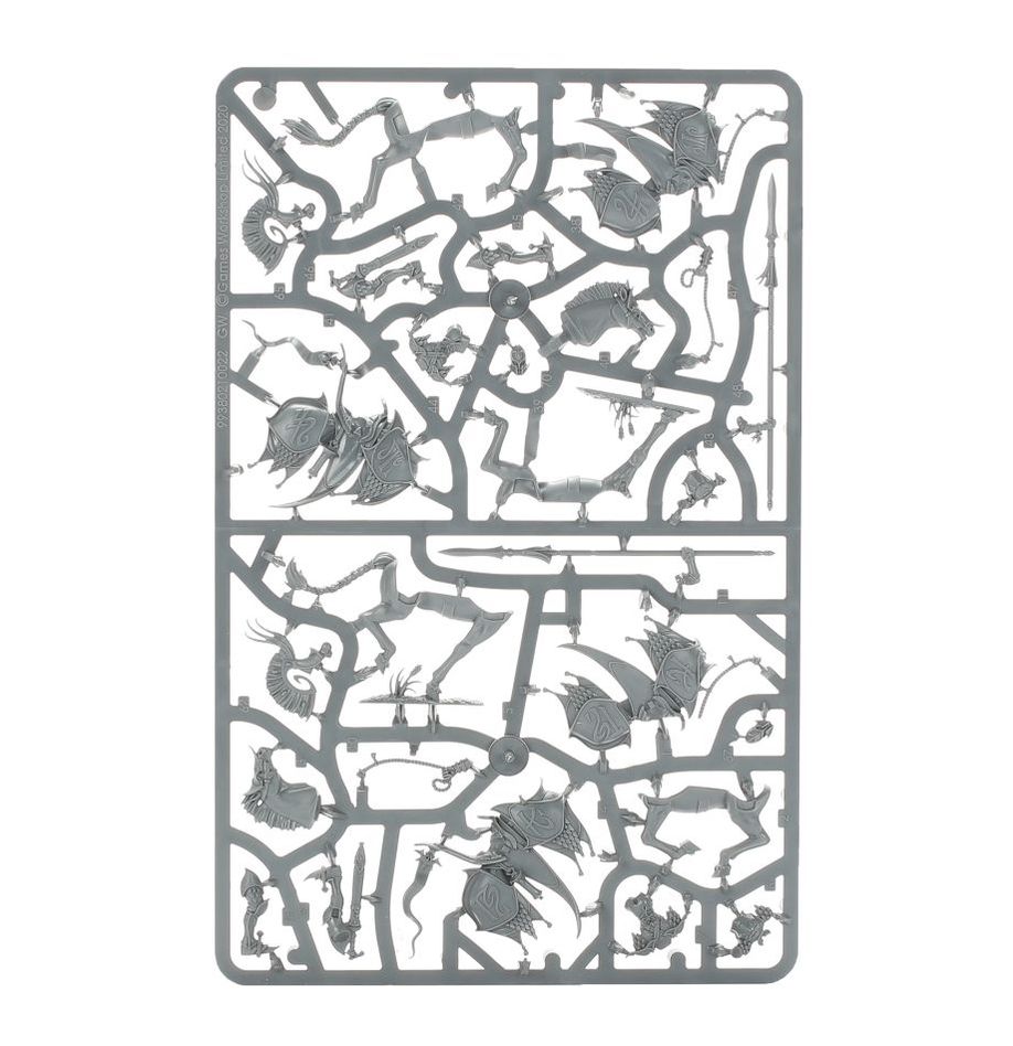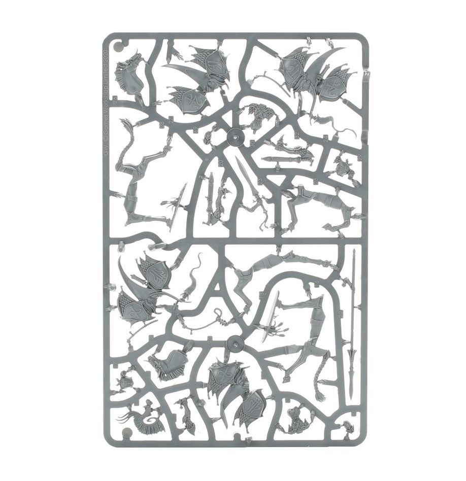 This kit builds 5 Vanari Dawnriders, with options to build a Steedmaster and Standard Bearer. Interchangeable shields and helmet crests allow for customisation. It is supplied in 79 plastic components and comes with 5 60mm x 35mm oval bases.