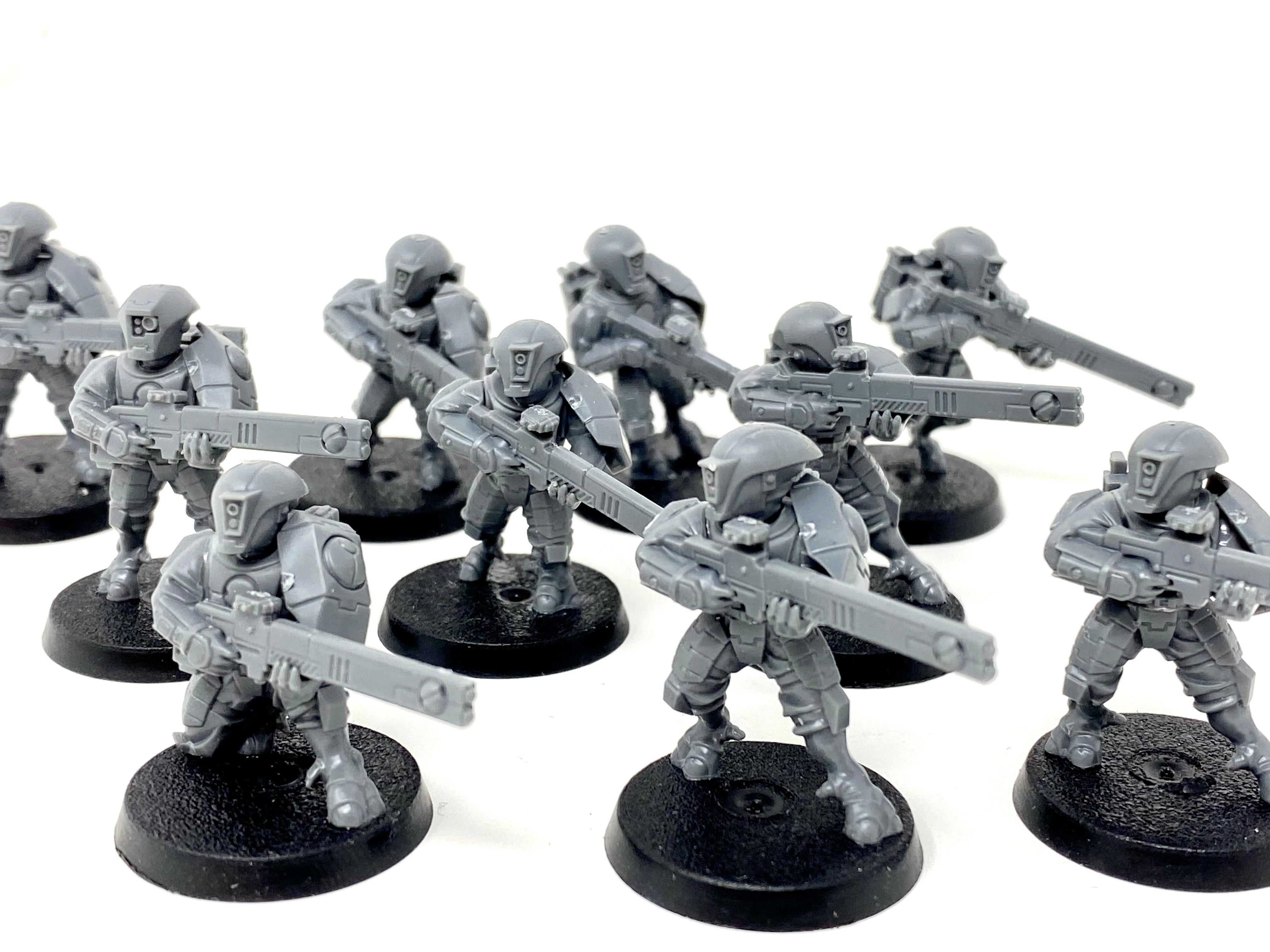 Biult and un-painted ten Tau Empire Fire Warriors, in their Strike Team configuration.