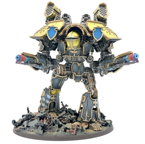 "Adeptus Titanicus" is a tabletop miniatures game created by Games Workshop, set in the Warhammer 40,000 universe. It specifically focuses on massive battles featuring gigantic war machines known as Titans. The game allows players to command these colossal war engines and engage in strategic combat on a smaller scale than the larger Warhammer 40,000 game. The game features highly detailed, large-scale miniatures of Titans, including Warlord, Reaver, and Warhound-class Titans, among others. Players assemble, paint, and customize these models before using them in battles that simulate the immense firepower and tactical complexity of Titan warfare. Adeptus Titanicus places a strong emphasis on strategy, maneuvering, and leveraging the unique capabilities of each Titan class. Players must manage their Titans' reactor levels, choose the right weapons for various situations, and utilize battlefield tactics to outmaneuver and outgun their opponents. The ruleset for Adeptus Titanicus has been updated and expanded since its reintroduction by Games Workshop, providing players with more options, scenarios, and depth in gameplay. Similar to other Games Workshop games, Adeptus Titanicus offers a combination of miniature collection, painting, and strategic gameplay, catering to hobbyists and fans of the Warhammer 40,000 universe who are particularly drawn to the awe-inspiring Titan warfare aspect of the setting.