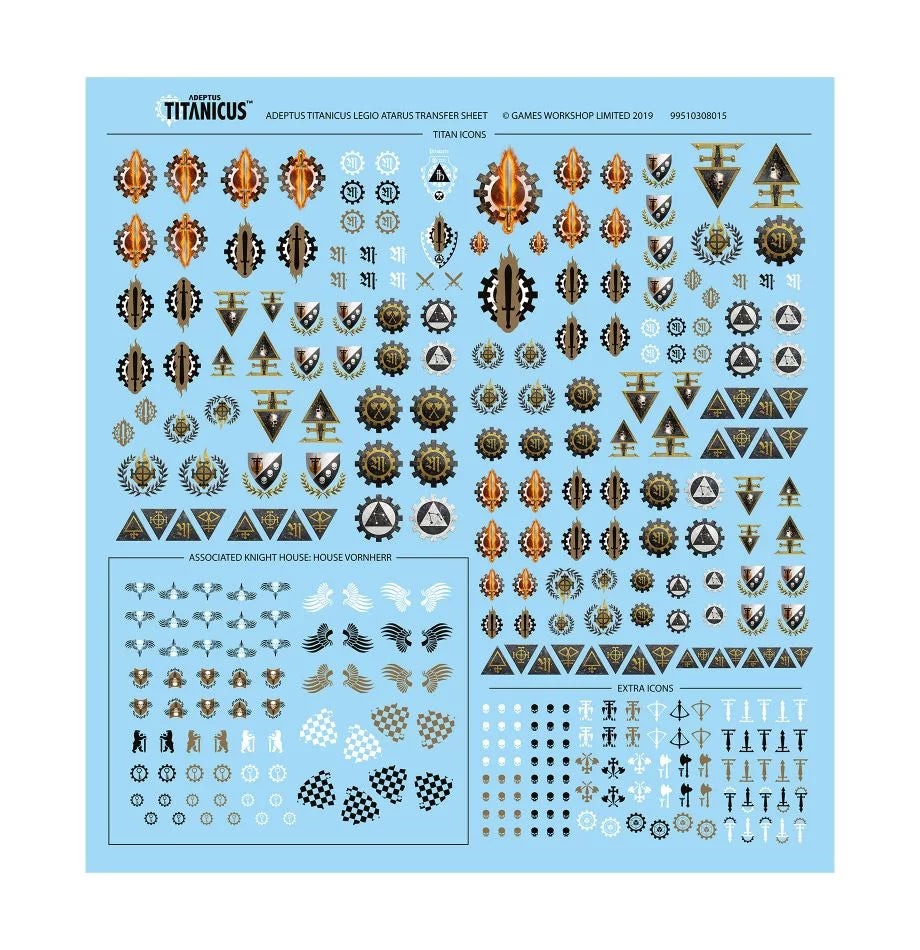 Decorate your Adeptus Titanicus Warlord, Reaver and Warhound Titans with this set of full-colour transfers depicting the icons of the headstrong Legio Atarus, known across the galaxy as the Firebrands. These can be added to carapaces and armour plates to enhance your paint job and demonstrate the fealty of your maniples. This sheet also includes transfers for the Knightly House Vornherr, close allies of the Legio Atarus, plus a host of kill markings and campaign badges.