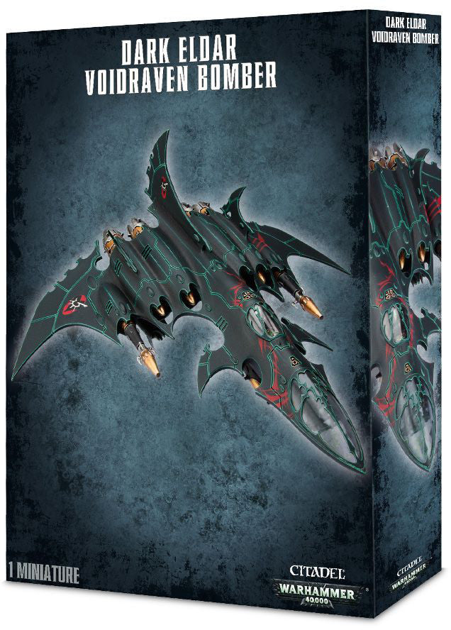 The Voidraven Bomber is designed to provide heavy support to Dark Eldar forces. This sleek, terrifying attack craft is capable of supersonic speeds while delivering a devastating void mine - a bomb that detonates two warheads, one establishes a crackling sphere of energy, the second releases a particle of pure darklight which annihilates anything trapped within the energy field.