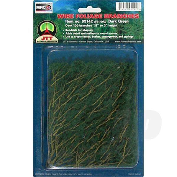 DARK GREEN WIRE FOLIAGE BRANCHES - Add detail and realism to your model scene with this set of wire foliage branches. Each set contains approx. 60 pieces of bendable wire trunks for shaping! Branches are flocked with dark green tone foliage. Branches measure approximately 1" to 3" tall. Great for creating shrubs, bushes, undergrowth and sapling trees.
