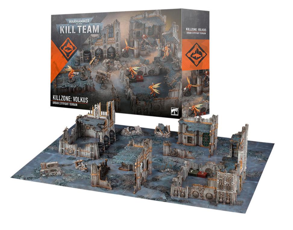Take your fight to the cities in the shadow of the Massif Ballistus with the standalone release of the Volkus Killzone Urban Cityfight Terrain set from the Hivestorm box set. It contains 14 pieces of terrain – two buildings, eight scatter terrain pieces, two large ruins and two small ruins, along with a double-sided game board to set your tight-knit firefights and shady covert operations on.