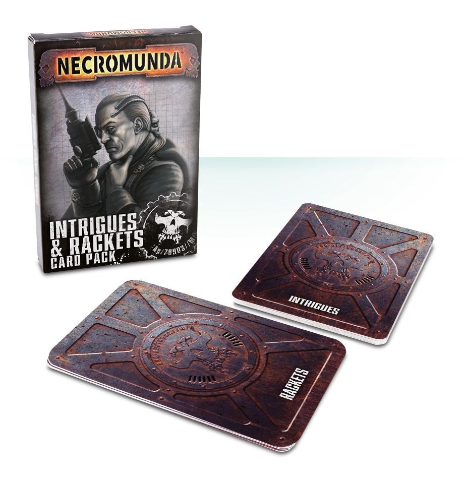This set contains 52 Intrigue and Racket cards for use during a Law and Misrule Campaign, as presented in Necromunda: The Book of Judgement, including 26 Rackets for gangs to fight over and 26 Intrigues for gangs to fulfil. The cards feature all of their special rules, and can be used as a handy in-game reference, as well as when determining which Rackets are available at the start of the campaign, and which Intrigues a gang can claim during a battle.