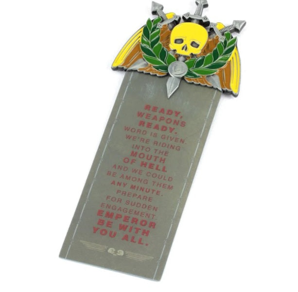 This bookmark is themed around the legendary Ibram Gaunt and is emblazoned with a quotation from the Colonel-Commissar as he prepares to lead his warriors into battle. The bookmark is capped with a metal topper that features the iconography of the Tanith First and Only Regiment.