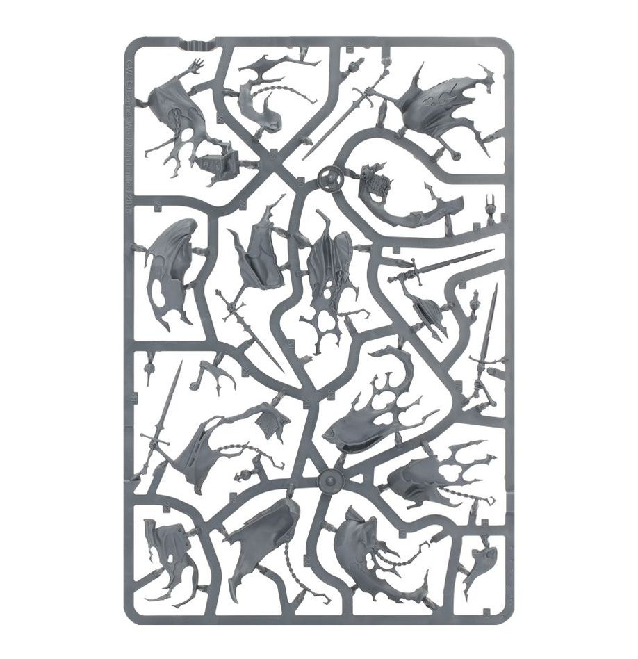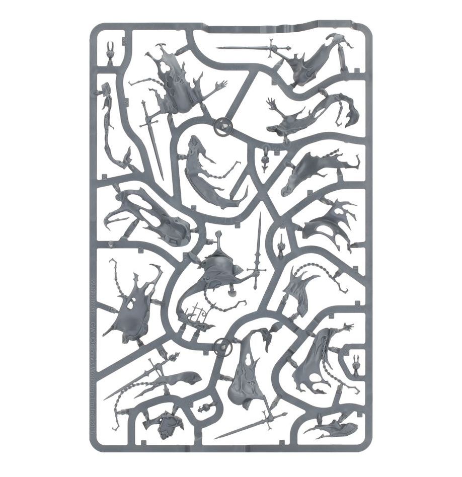 This multi-part plastic kit contains the components necessary to assemble 10 Bladegheist Revenants. Eternally tormented spirits, they are clad in tattered cloaks which fade away into ethereal elements, appropriate to the panicked, frantic fighting style they exemplify. Each is posed swooping and jinking unpredictably; the chains that bind them to Shyish are swinging wildly about their forms. Within the cloaks, metallic face masks peer out – there are 10 of these included, each a different design, which can be modelled on any cloak assembly you desire. There are 10 tomb greatblades included, each of which is slightly different.