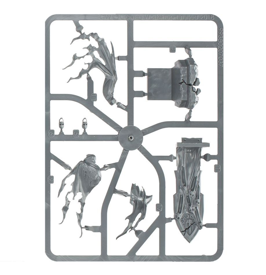 This multi-part plastic kit contains the components necessary to assemble Kurdoss Valentian, the Craven King. Seated silent and unmoving on his cracked, crumbling throne, Kurdoss is a hunched, slumped figure who nonetheless exudes an aura of pure menace, with his sinister, 3-pointed crown entirely enclosing his face in a skull-like mask. One hand clutches the arm of his throne, while the other holds the Sepulchral Sceptre – far from an ornate, bejeweled ceremonial staff, this is a solid weapon designed to crack open the skulls of those who rouse Kurdoss’ fury. Flanking him on either side are his accompanying Wraith Heralds, who are bound to him eternally – one as a banner-bearer, the other carrying a trumpet. The twisted forms of tormented souls rise high above Kurdoss, and the whole miniature is borne aloft on a swirling column of ethereal energy which attaches to the base.